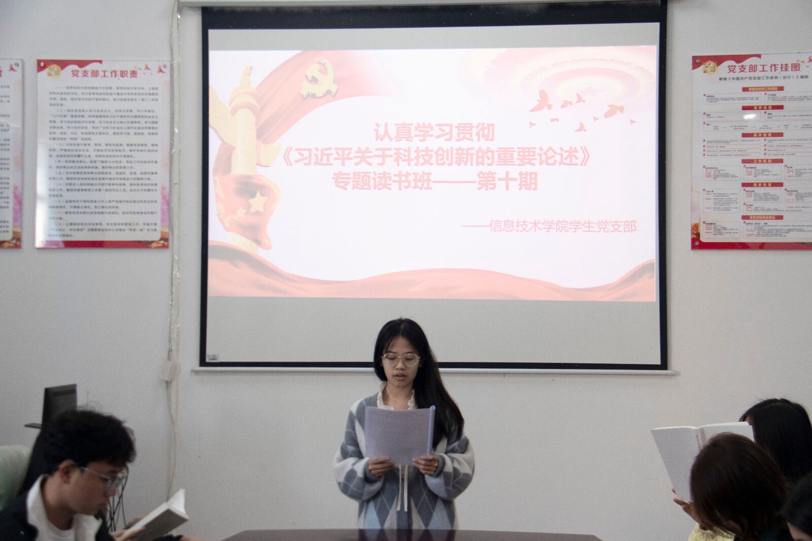 3月21日,太阳成集团tyc151cc员工党支部在4-213会议室开展学习贯彻《习近平关于科技创新的重要论述》第十期专题读书班。本次读书班由王宇佳同学主持,入党积极分子、入党申请人以及共青团员代表一同参加。