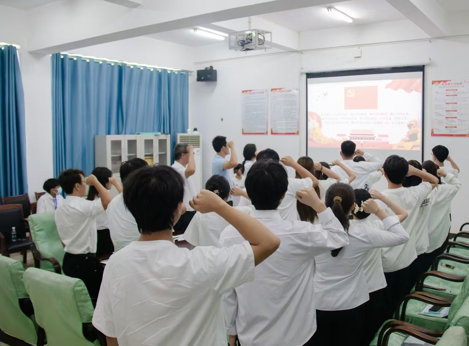 活动启幕,员工党支部书记代晓明老师以温暖问候开启序章,带领大家开展第一议题集中学习。其实,“政治生日”有丰富的内涵。习近平总书记说:“无论在哪个方面、哪个部门、哪个地方工作的党员干部,首先要明白自己的第一身份是共产党员,第一职责是为党工作,第一目标是为民谋利,始终把党和人民放在首位,不断提高自身的能力和本领,切实为人民执好政、掌好权。随后,代老师深度阐释政治生日对筑牢信仰根基、唤醒党员身份认同的价值,宣告这场“初心洗礼”正式起航。全体党员高举右拳,面向鲜红党旗,在领誓人引领下重温入党誓词。誓言如钟,声声叩问初心,传递着党员坚守信仰的坚定决心。