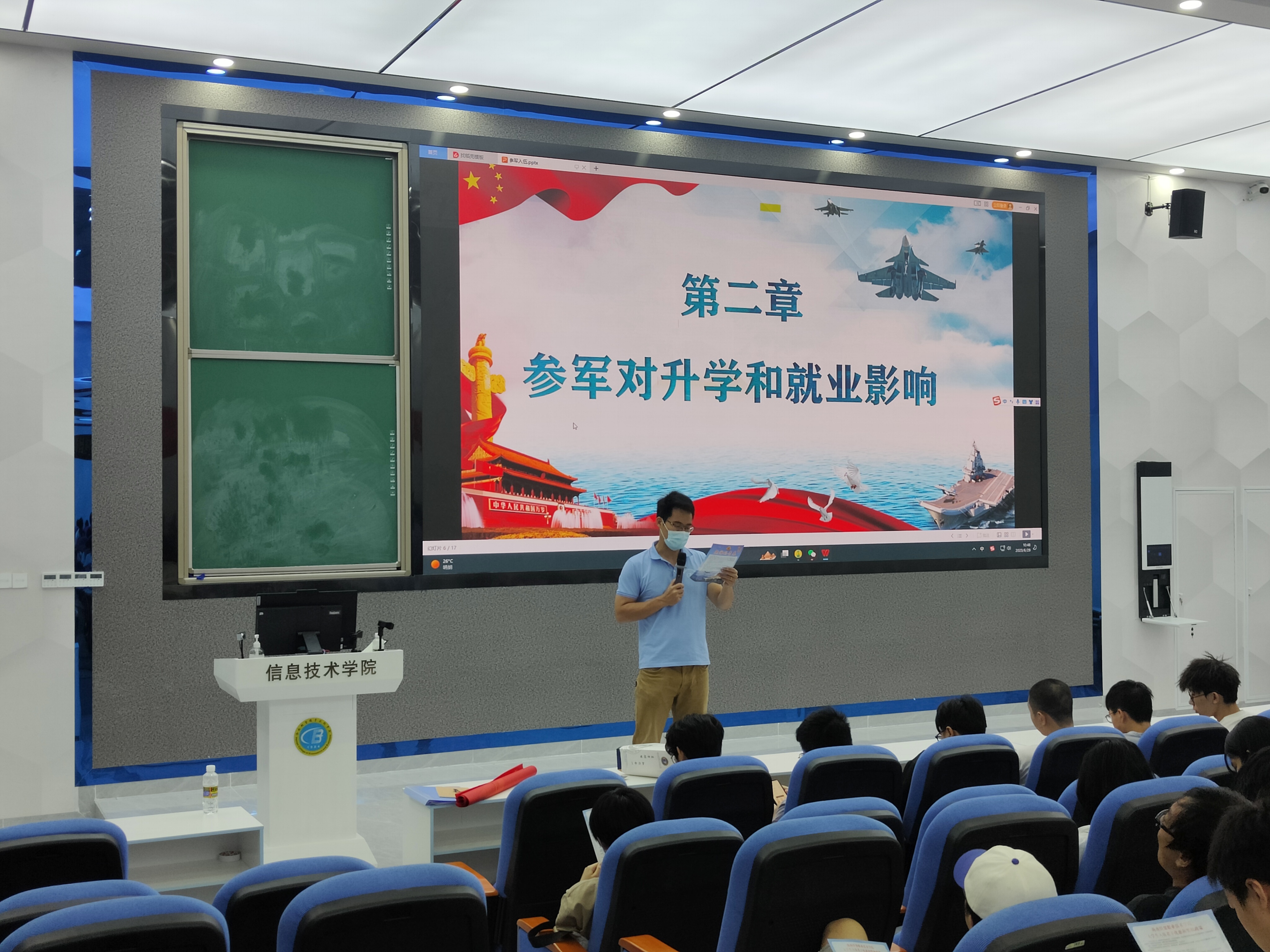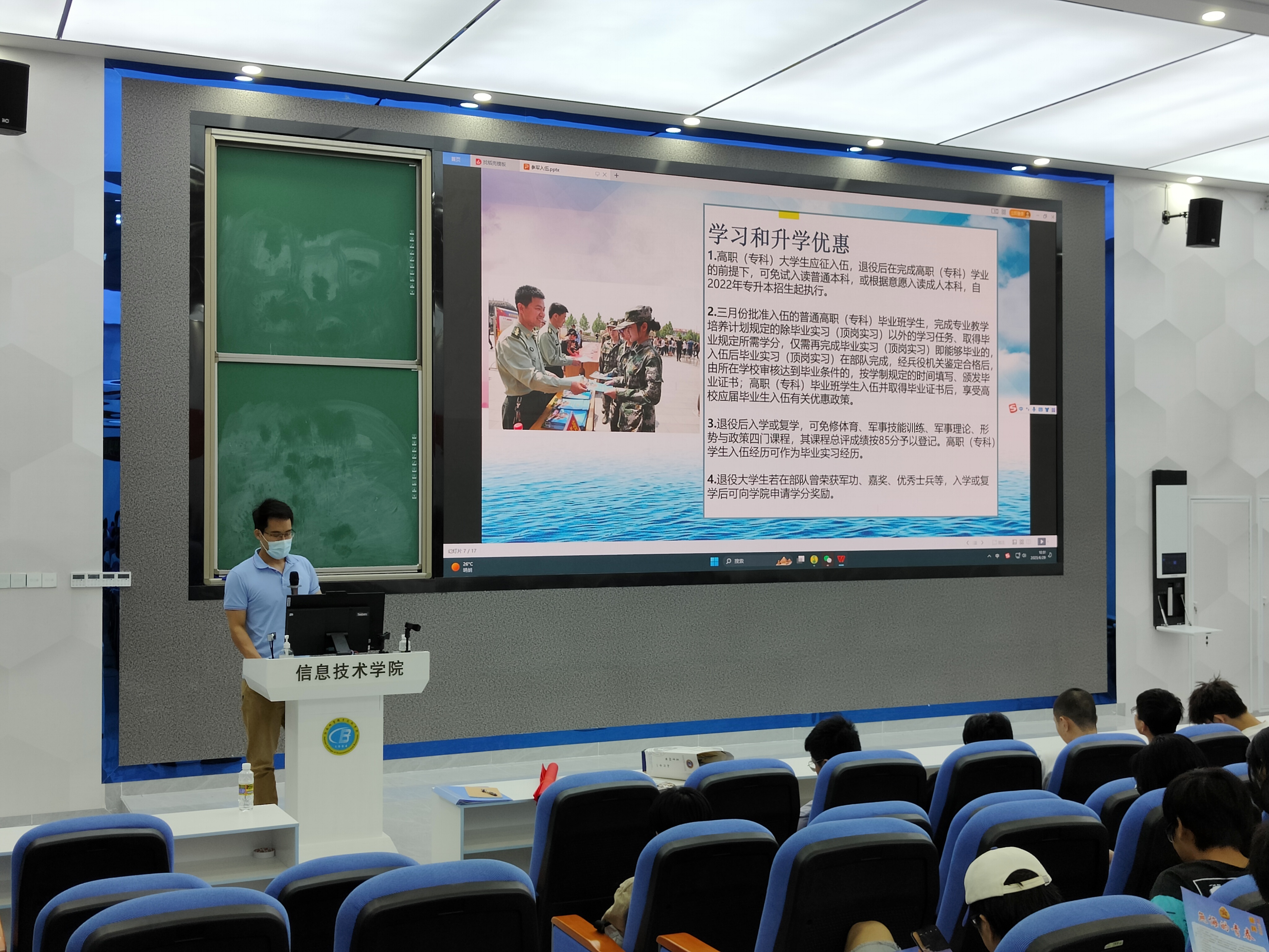 宣讲伊始,唐图老师给同学们观看2023年征兵宣传片,让信息学子热切感受到人民子弟兵对祖国的热爱、对社会的责任、对人民的守护。紧接着,唐图老师向全体同学详细解读了在校生入伍的优惠政策,老员工参军入伍不仅可以积攒一份与众不同的人生阅历,锤炼一种军人钢铁般的意志,还能积累到一份无形的精神财富,享受到政府赋予的各种优惠福利政策。