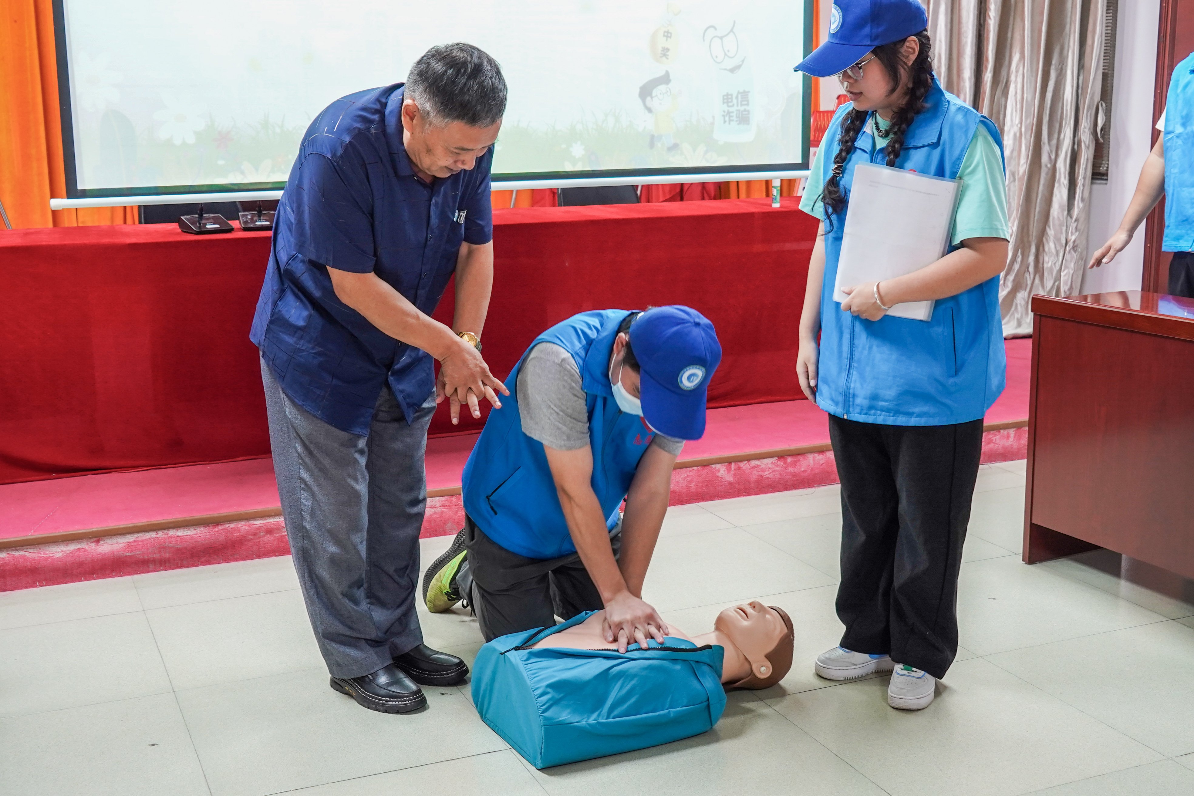 宣讲活动开始后团队成员从“未年人保护法保护什么”、“如何预防校园欺凌”、“防溺水六不准”、“预防火灾及防毒面具、灭火器材如何使用”“交通安全常识讲授”、“急救知识普及与现场教学”、“禁毒科普课堂”、七个方面开展未成年人保护宣讲和中老年人“防诈骗和急救知识普及宣讲。通过案例视频播放、知识科普、发放活动宣传扇和宣传、现场活动竞答、实景示范操作,道具演绎等理论与实践相结合的方法,让孩子们入脑入心。