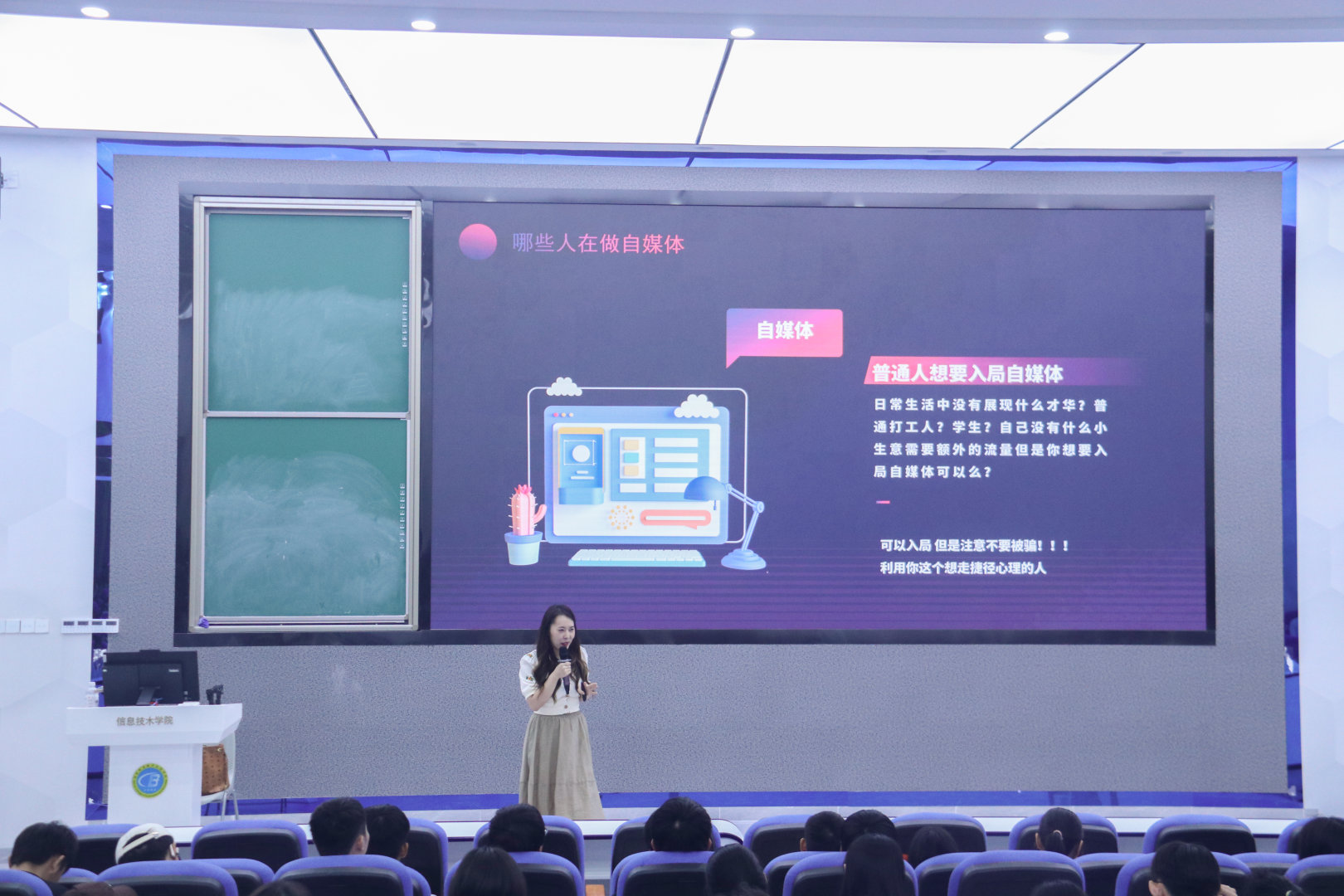 讲座伊始,王倩老师以“新媒体与自媒体的区别”为题与同学们展开讨论,通过分析两者之间区别,让同学们了解新媒体的白皮是自媒体,再以合集类、干货类、实拍类、测评类四个类别及自媒体流程来分析“新手做自媒体如何选题”,加深同学们对于自媒体的印象。紧接着,从什么样的人适合做自媒体、如何涨粉、如何变化三个方面分享怎样做好自媒体。通过现场互动、举例说明,纠正误区等方式带动同学们进行深入思考,从而更进一步地去认识和学习自媒体相关知识。最后,王老师提醒同学们做自媒体不要妄想走捷径,容易上当受骗,重要的是脚踏实地和勇于坚持。讲座结束后,同学们纷纷表示收获满满。