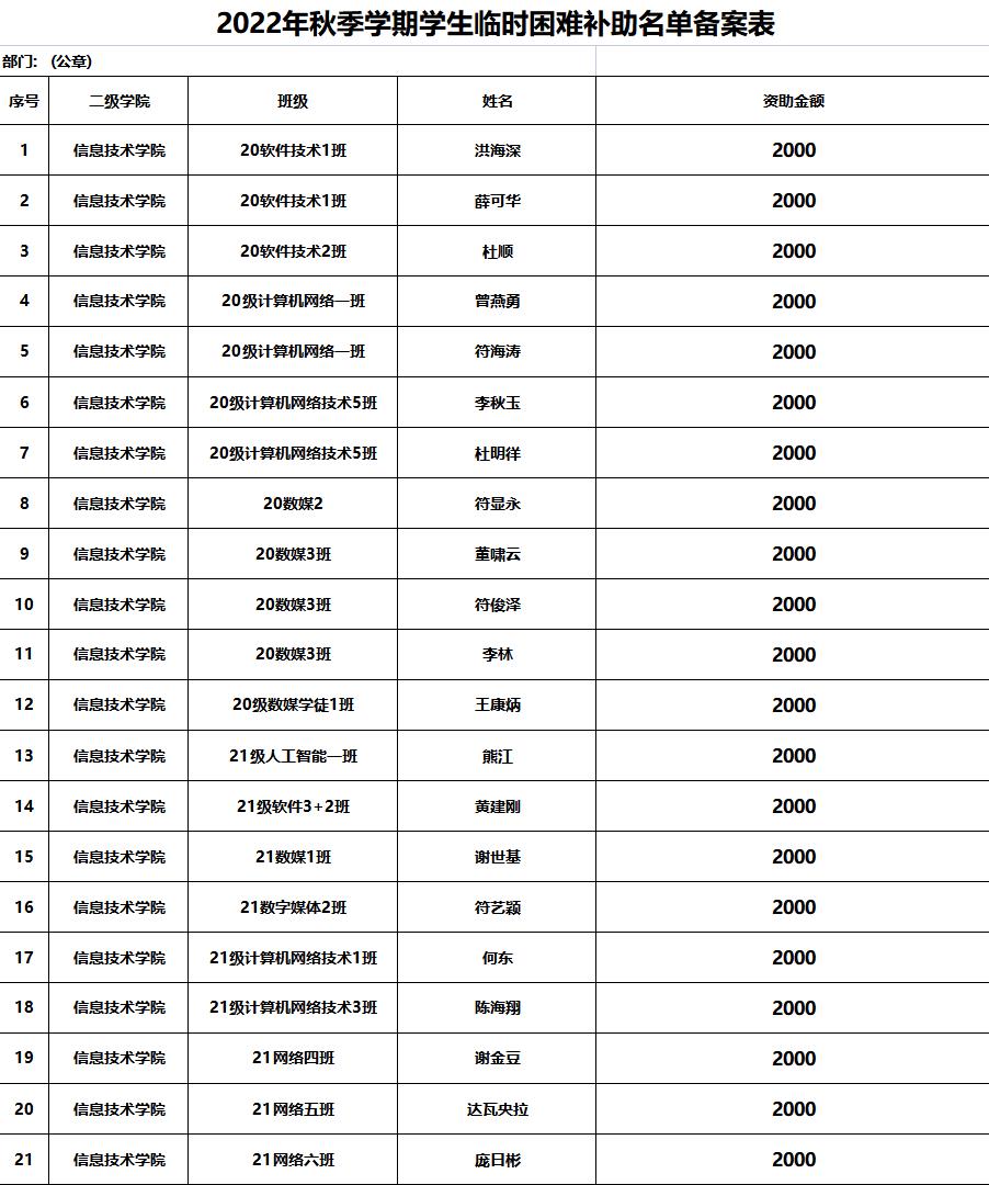根据《海南省教育厅关于扎实推进2022年秋季学期员工资助工作的通知》(琼教勤助〔2022〕22号)精神并结合《太阳成集团tyc151cc关于发放家庭经济困难员工临时困难补助的通知》有关规定,经员工自主申请、年级专业(班级)评议小组评议、二级公司评审小组初审公示,并经公司员工资助评审小组复审,现将名单进行公示,接受广大师生监督。