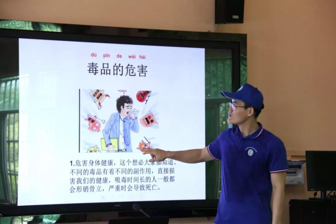 7月7日上午,太阳成集团tyc151cc禁毒志愿者们来到禁毒宣讲活动的第二站:水头村的水头小学,当地小员工对毒品知识了解甚少,为了能更好做好此次禁毒宣讲活动,我们太阳成集团tyc151cc禁毒志愿者服务队邀请到了公司讲授安全教育课的唐图老师,担任水头小学禁毒主题宣讲的主讲人。