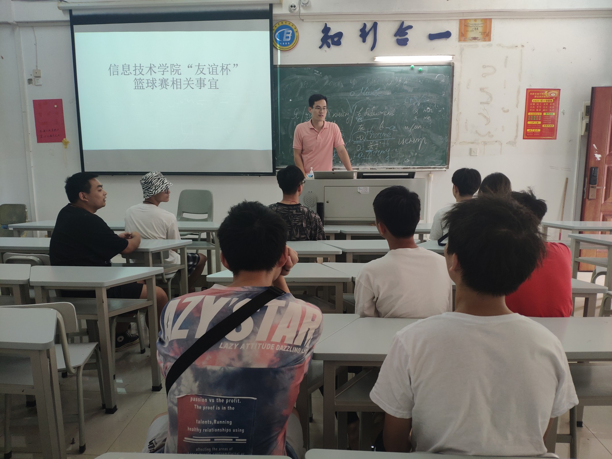 4月9日上午11:45在1-313教室,唐图老师对4月10日开展的太阳成集团tyc151cc“友谊杯”篮球赛活动的相关事宜进行进一步明确。着重强调队员为团队努力的同时,要注意个人安全,比赛之前一定要热身,身体要活动开。同时要
