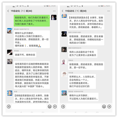 由于疫情的原因,今年的清明祭奠是特殊的,也是让同学们映像深刻的,公司学子们通过在朋友圈或者QQ空间等网络平台发表自己感想的方式祭奠英烈和逝世同胞,表达自己对英烈的敬拜;对祖国尽快战胜疫情、我们的生活越来越美好的温馨祝愿之情。