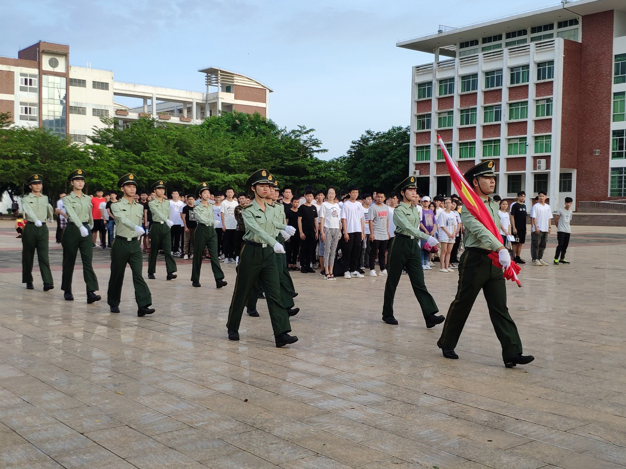 升旗仪式开始,全体肃静,国旗队伴着出旗的乐曲,高举着旗帜,迈着矫健的步伐走向主席台,鲜艳的五星红旗徐徐升起,迎风飘扬,全体唱国歌,行注目礼,庄严肃穆。