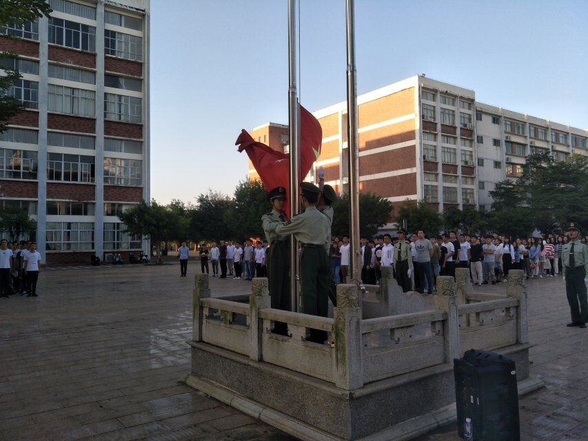 仪式伊始,校员工会国旗班迈着标准整齐的步伐,口号响亮,刚劲挺拔地护送国旗进场,在庄严的国歌声中,全体师生心怀着对祖国的崇敬热爱和对党的忠诚追求向五星红旗行注目礼,国旗在人们的注目礼中缓缓升起高高飘扬海经贸广场的上空。