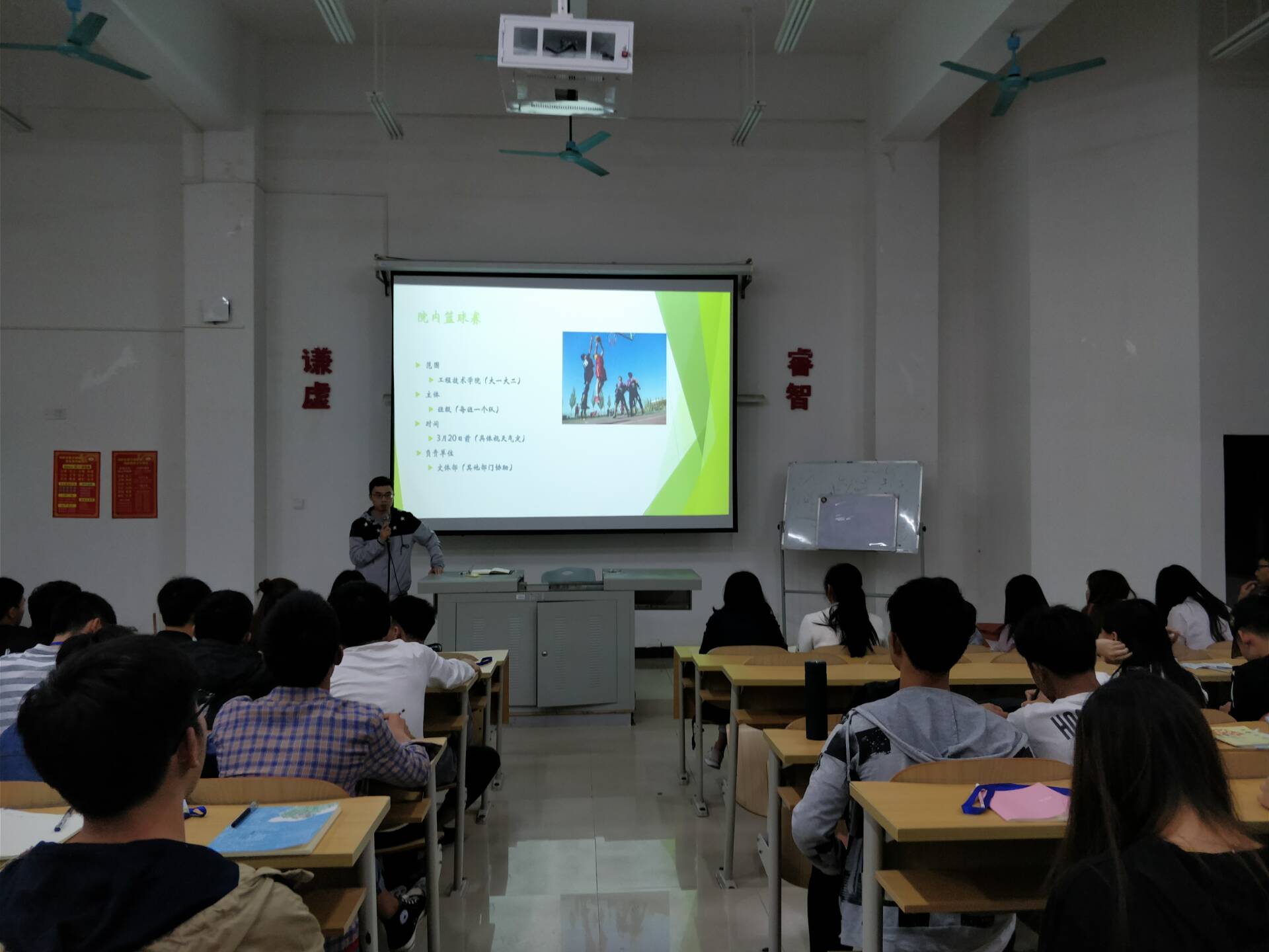 大会第一项为团学青成员说明了本学期的工作计划及活动。本学期工作计划有3月份的“院内篮球赛”、4月份的“表情包制作”、“礼仪操比赛”、五月份的“五一晚会”、“红歌比赛”、“母亲节系列活动”、“打字大赛”、“父亲节和端午节系列等活动”及增加了一些团学青的常规活动,如每月的生日会,院内的联谊。大会第二项,为了加深各部门成员相互认识与了解,让成员们自愿上台分享一下假期生活。