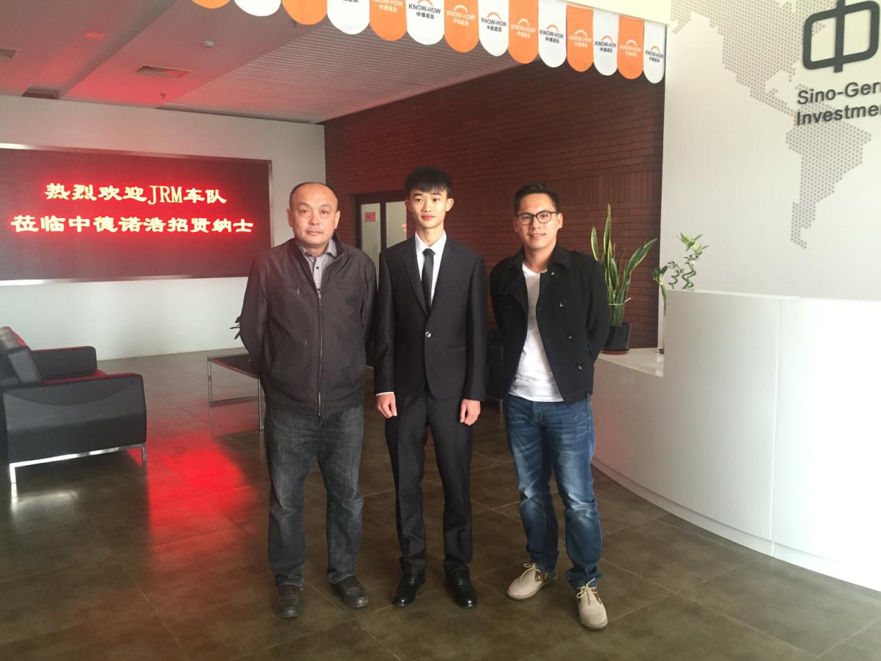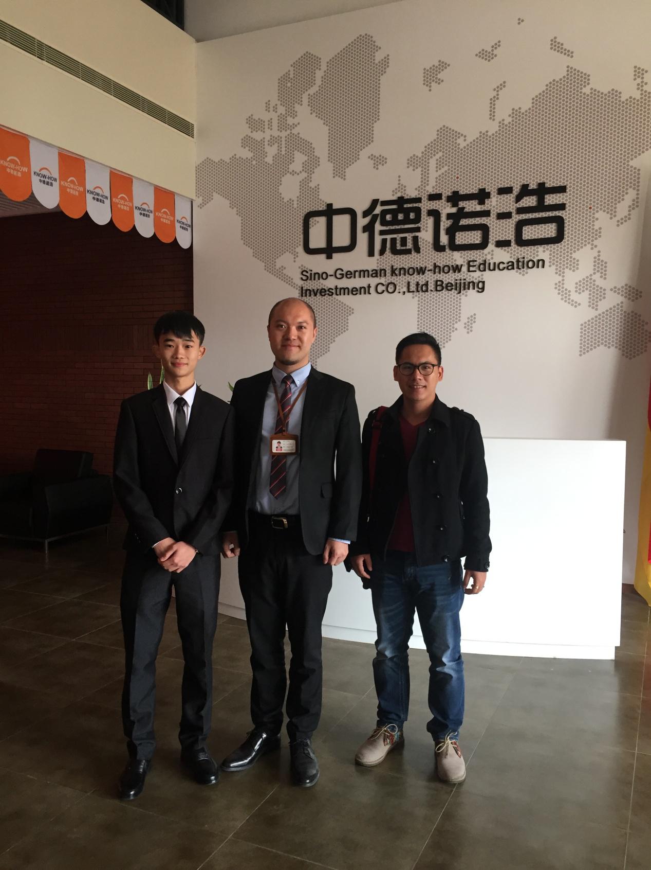 保时捷JRM车队负责人与公司通过最终轮面试学生黎传杨、指导老师陈明合影