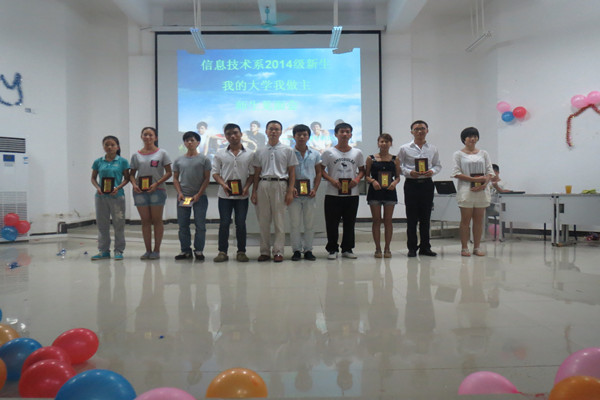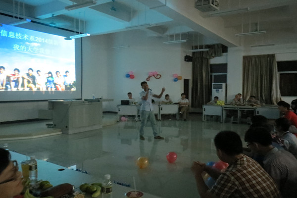 本系9月12日讯(信息技术系 丁燕琴报道)9月11日晚7:30,我系在2-408教室举行了以“我的大学我做主”为主题的2014级新生见面晚会,出席嘉宾有:我系党总支书记陈继敏书记、系学工办主任陈亚芳老师、系主任王忠老师、系办公室主任周波老师、系教学秘书吴明珠和韩昌豪老师、系学工办副主任梁其钰和刘露思老师、系副主任王凡帆、计算机网络技术专业负责人王岩、电子商务专业负责人单继周、计算机多媒体技术专业负责人李兵、辅导员龙腾老师。其中由员工会全体人员和14级各班代理班主任进行布置现场以及维持现场秩序。