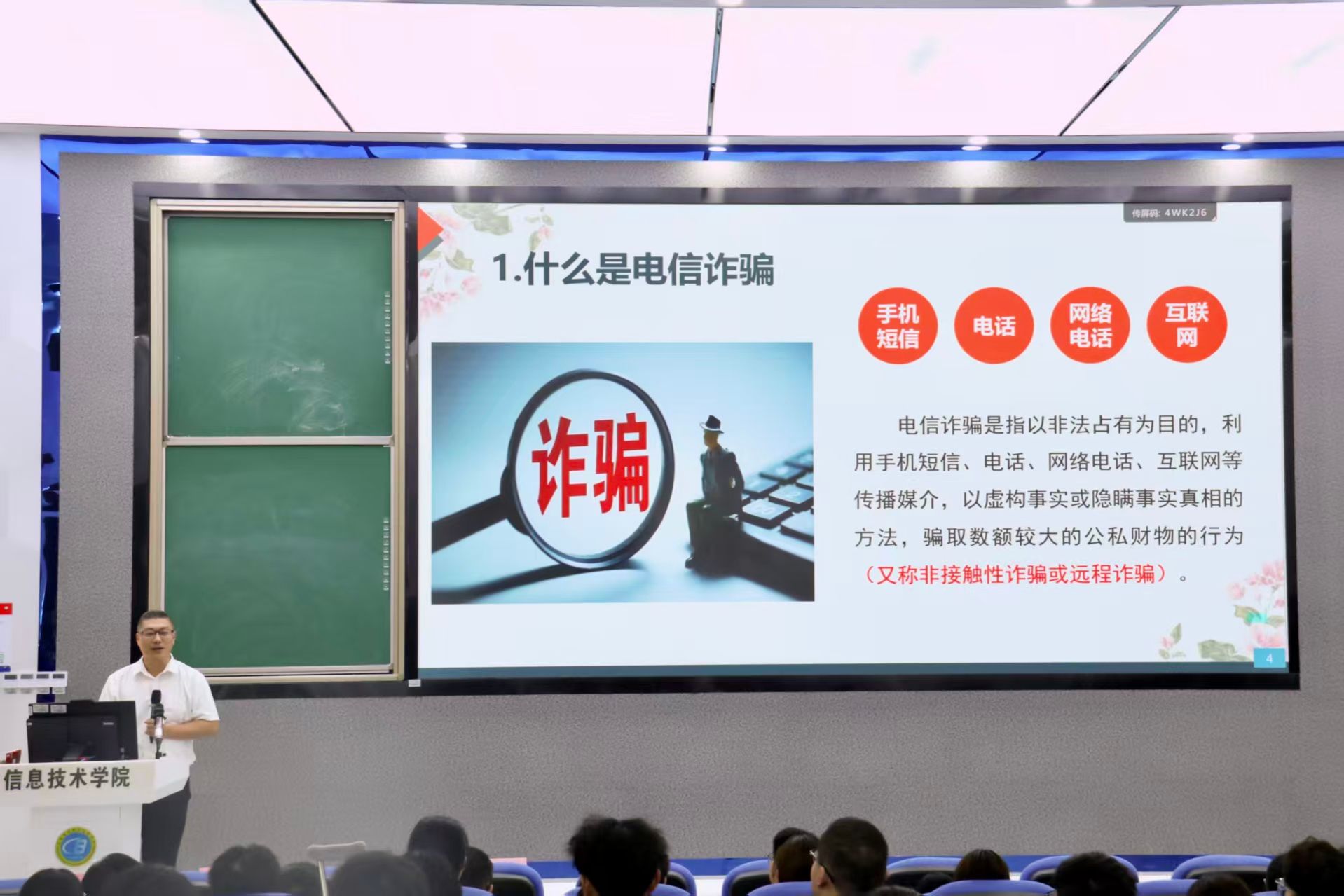讲座伊始,黄守官副书记结合当前电信诈骗的高发态势,明确指出了开展此次防范教育的重要性与紧迫性。他从“什么是电信诈骗”切入,详细阐释了电信诈骗是以非法占有为目的,利用手机短信、电话、网络等传播媒介,虚构事实或隐瞒真相骗取数额较大公私财物的非接触性诈骗行为,让新生对诈骗本质建立起清晰认知。