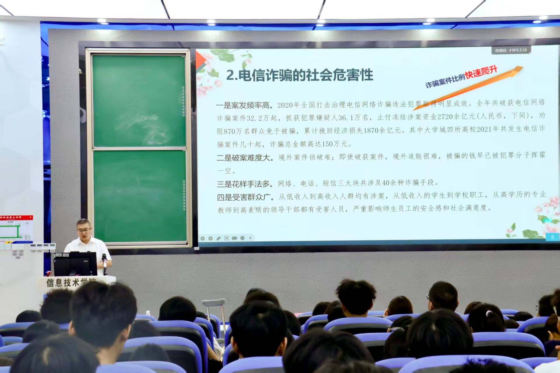 随后,黄副书记重点剖析了电信诈骗的社会危害性。他援引数据指出,此类案件案发频率高,仅大学城四所高校2021年就发生数十起,涉案金额巨大,同时还具有破案难度大、诈骗手法多、受害群众广等特点,严重影响师生安全感与社会满意度。针对新生群体易受骗的特点,他系统讲解了五大类常见诈骗形式,包括以刷单、虚假中奖为代表的“钓鱼类”诈骗,针对情感需求的“美人计”诈骗,冒充客服、领导的“冒充类”诈骗,以及恐吓类和连环套诈骗,并结合多个真实案例深入拆解了每类骗局的操作流程与迷惑点。
